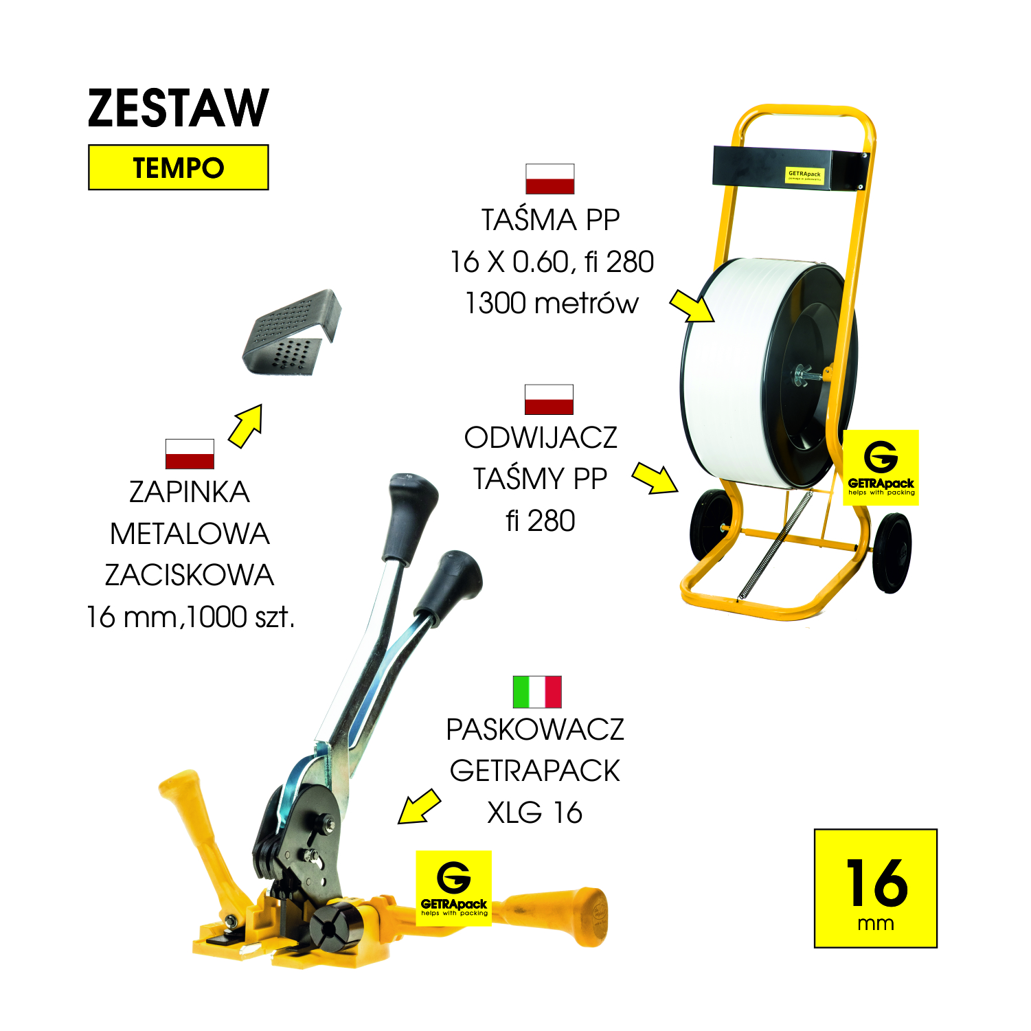 Zestaw pakujący TEMPO z wysokiej jakości urządzeniem spinającym, jakim jest Paskowacz GETRApack oraz odwijaczem na kółkach GETRApack, który ułatwia przemieszczanie się z nim. Wózek posiada hamulec, pojemnik na spinki oraz metalowe tarcze zabezpieczające taśmę. Taśma łączona jest za pomocą metalowej zaciskowej zapinki. Kompletny zestaw, pozwalający natychmiast rozpocząć  proces pakowania palet lub paczek. W skład wchodzi Paskowacz, Odwijacz, zapinki oraz taśma polipropylenowa 16 mm.